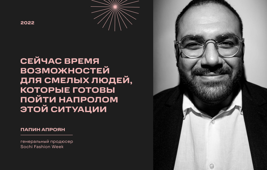 В Сочи завершилась неделя моды. Курортная столица России в пятый раз приняла Sochi Fashion Week. В нынешнем году свои коллекции представили более 20 российских дизайнеров. Мы поговорили с Папином Апрояном – генеральным продюсером Sochi Fashion Week об итогах сочинской недели, планах на будущее и перспективах индустрии.